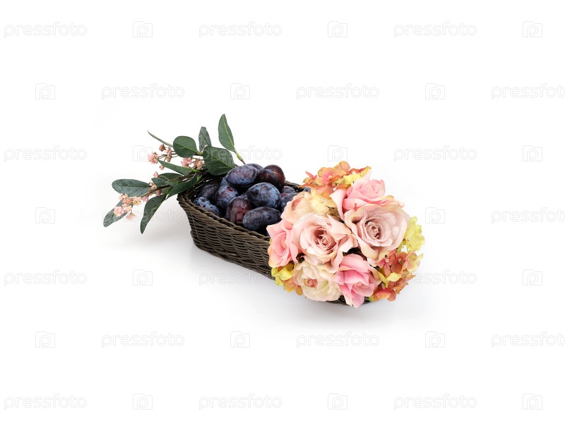 Ручно сделанная плетеновая корзина с цветами и сливами, изолированные на белом фоне