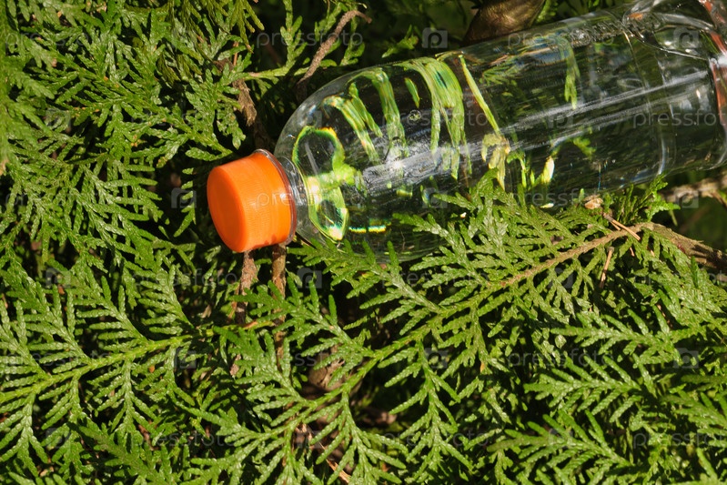 Бутылка с водой против зеленого леса