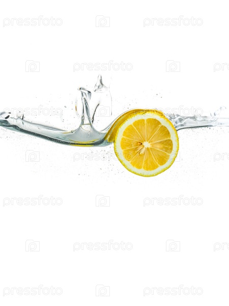 Лимон падает в воду с пузырями (изолированный макет фона)