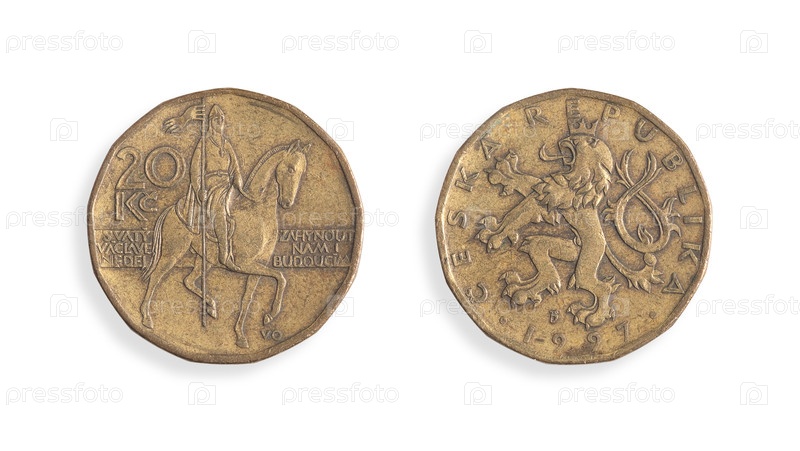 Монета чешских 20 крон. Чехская надпись 'Чешская Республика'. 20 крон. Святой Вацлав, не дай нам и нашему будущему погибнуть. Элемент дизайна с подстриженной тропой