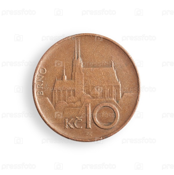 Монета чешских 10 крон.Чешская надпись '10 крон'.Святой Вацлав, не дай нам и нашему будущему погибнуть.Элемент дизайна с подстриженной тропой