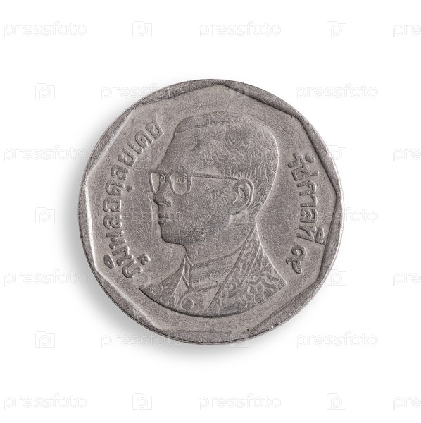 Таиландская монета номиналом 5 бат выделена на белом фоне.Тайская надпись на английском языке означает Король Бумибол Адульядеш Великий.Элемент дизайна с подстриженной тропой