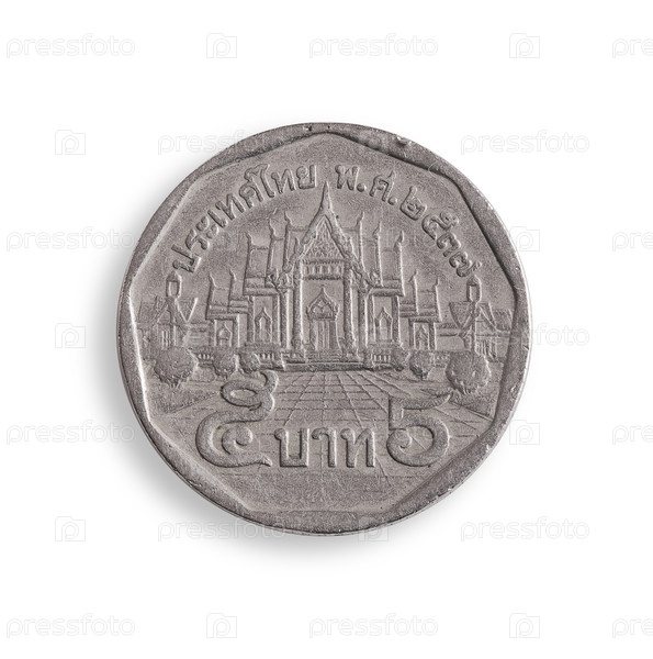 Таиландская монета номиналом 5 бат выделена на белом фоне. Тайская надпись означает 5 бат. Мраморный храм по-английски. Элемент дизайна с обрезанной дорожкой