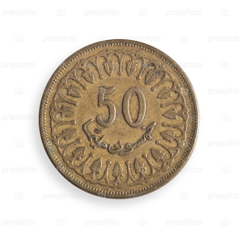 Тунисская монета длиной 50 мм выделена на белом фоне.Тунисская надпись на английском языке означает 50 миллиметров