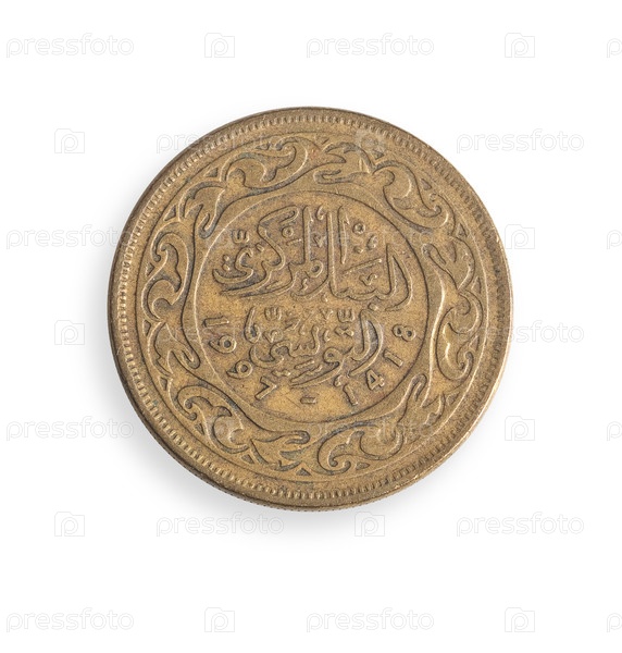 Тунисская 50-миллиметровая монета выделена на белом фоне.Тунисская надпись на английском языке означает 'Центральный банк Туниса'