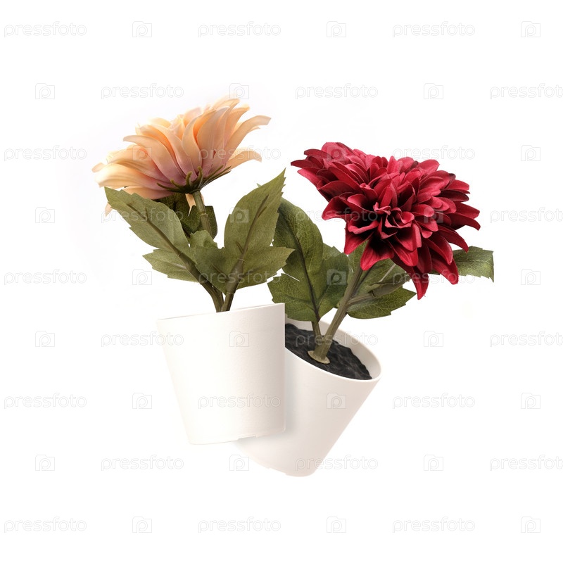 Розовые искусственные цветы в белых горшках, изолированных на белом фоне
