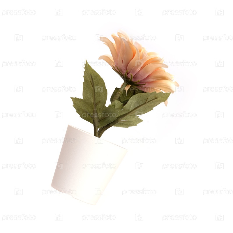Розовые искусственные цветы в белых горшках, выделенные на белом фоне