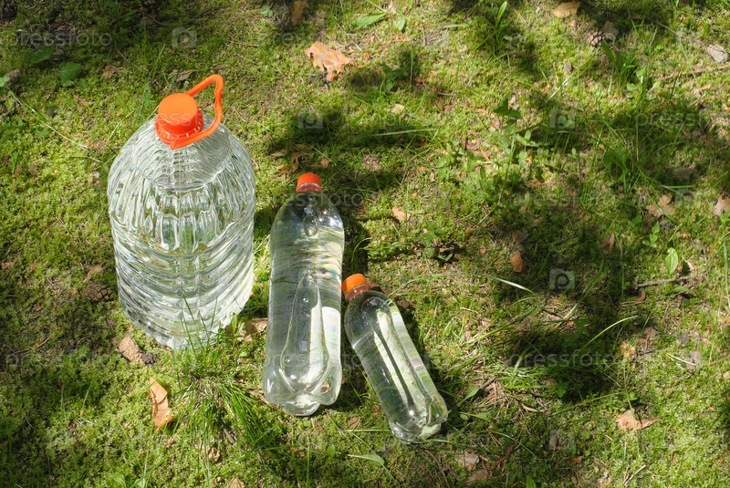 Три бутылки воды против зеленого леса