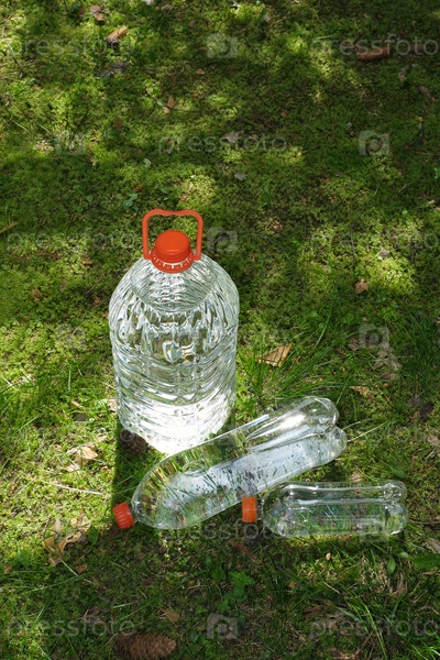 Три бутылки воды против зеленого леса
