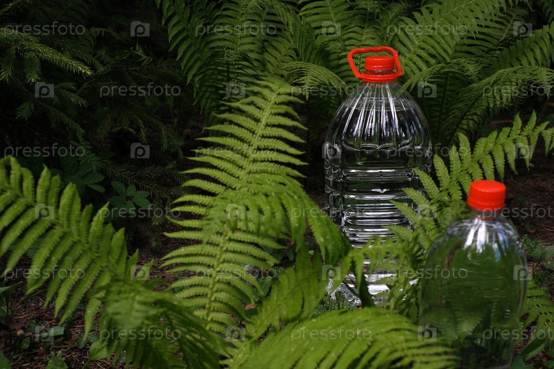 Две бутылки воды против зеленого леса