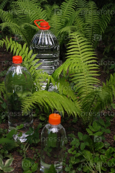 Три бутылки воды против зеленого леса
