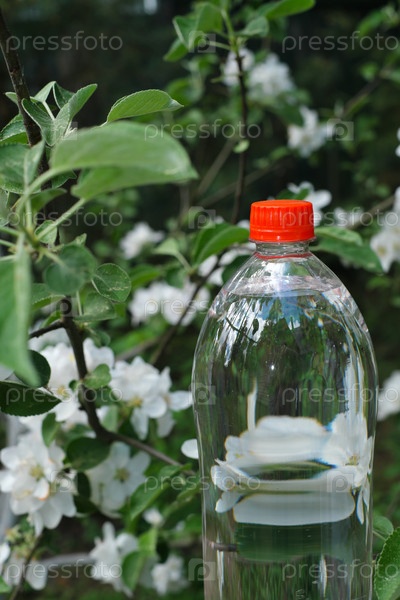 Бутылка воды в цветущем саду.Дизайн упаковки