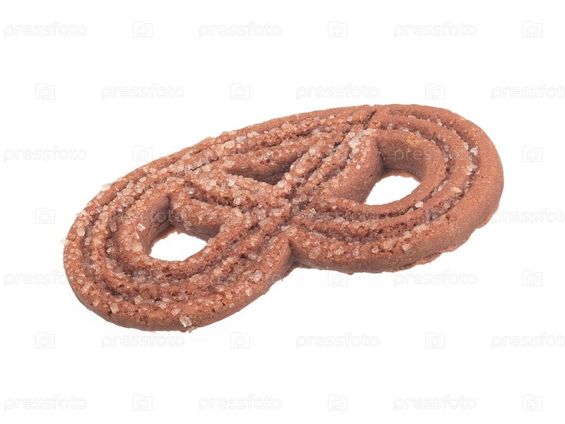 Шоколадный прецел с кристаллами соли и сахара, выделенными на белом фоне