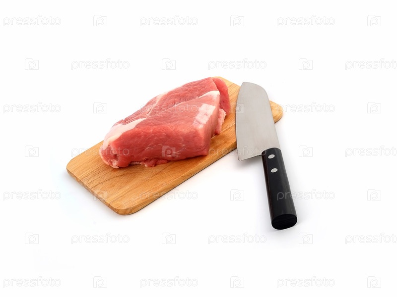 Кусок сырого мяса на режущей доске и нож на белом фоне