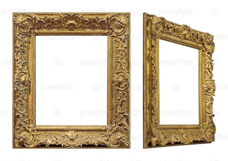 Золотая рама для картин, зеркал или фотографий в фронтальной и перспективной формах, изолированных на белом фоне
