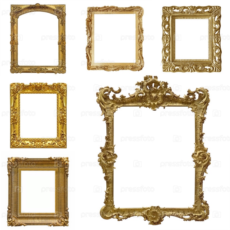 Набор золотых рамок для картин, зеркал или фотографий, изолированных на белом фоне