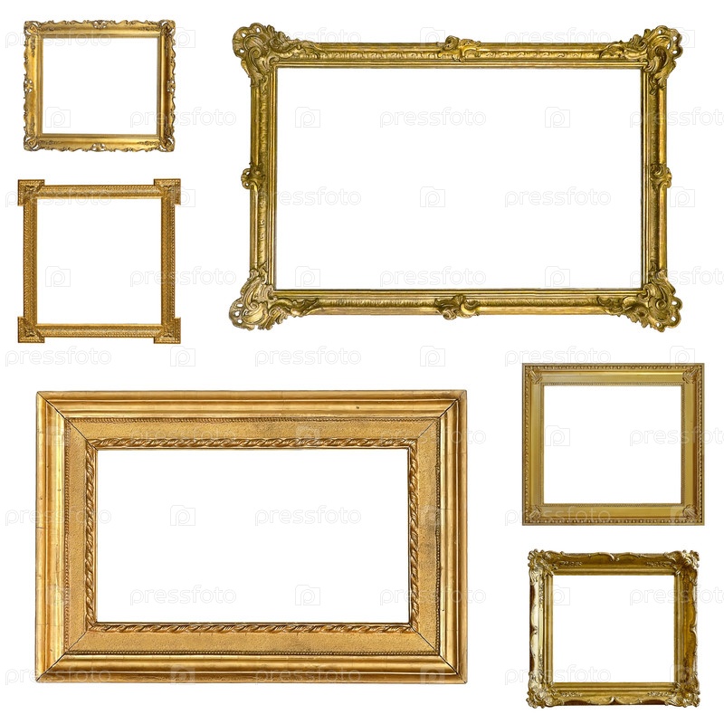 Золотые рамы для картин, зеркал или фотографий, изолированных на белом фоне (множество изображений)