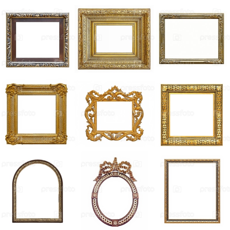 Набор золотых рамок для картин, зеркал или фотографий, изолированных на белом фоне