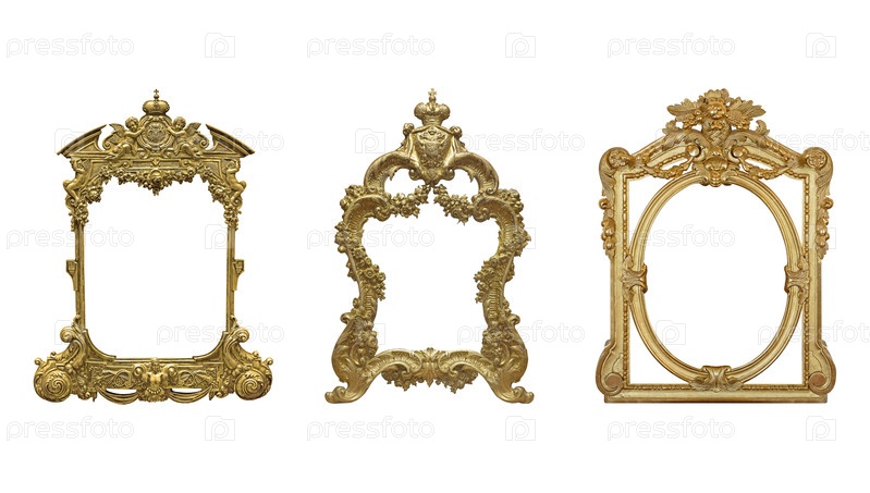 Набор золотых рамок для картин, зеркал или фотографий, изолированных на белом фоне
