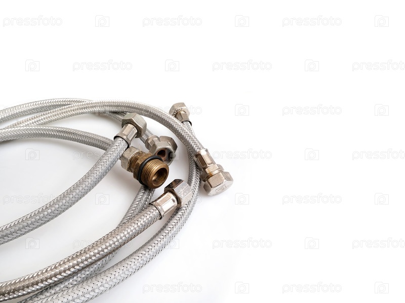 Гибкие водопроводные трубы в металлическом слюне, изолированный на белом фоне
