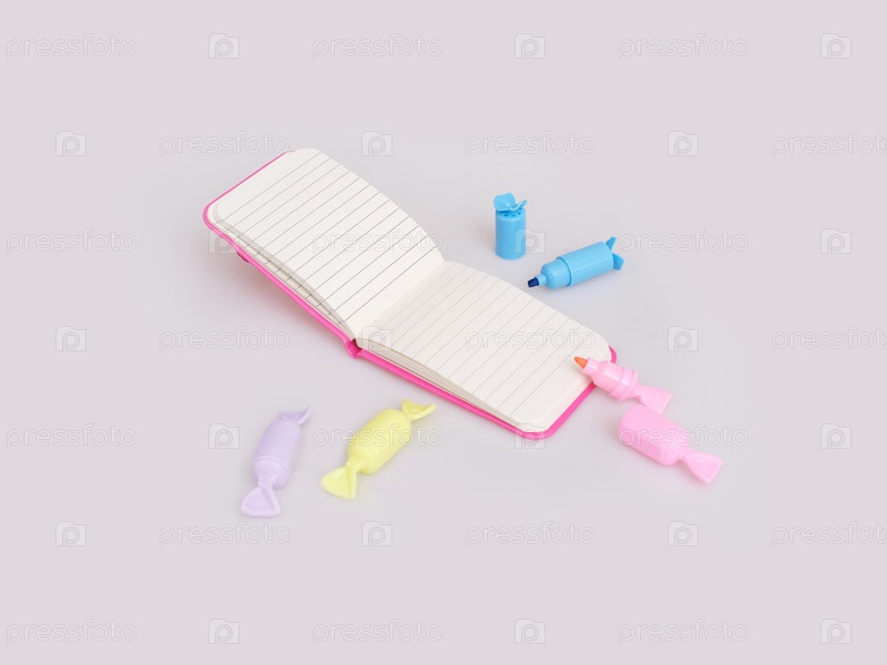 Композиция (мокап) с розовым блокнотом и многоцветными маркерами, подчеркнутыми на белом фоне