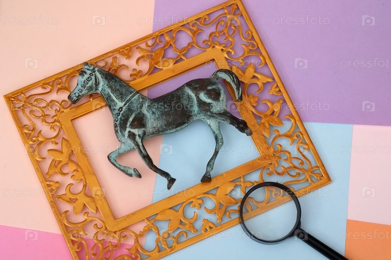 Композиция с фигуркой древней бронзовой лошади, изолированной на цветном фоне