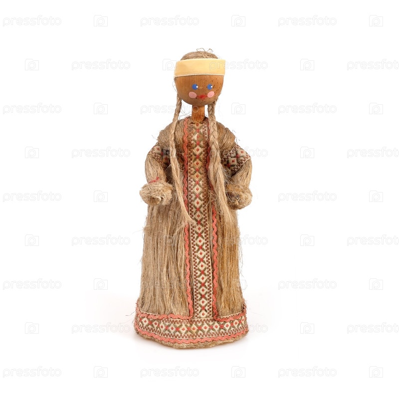 Соломенная сувенирная кукла в национальном костюме изолирована на белом фоне