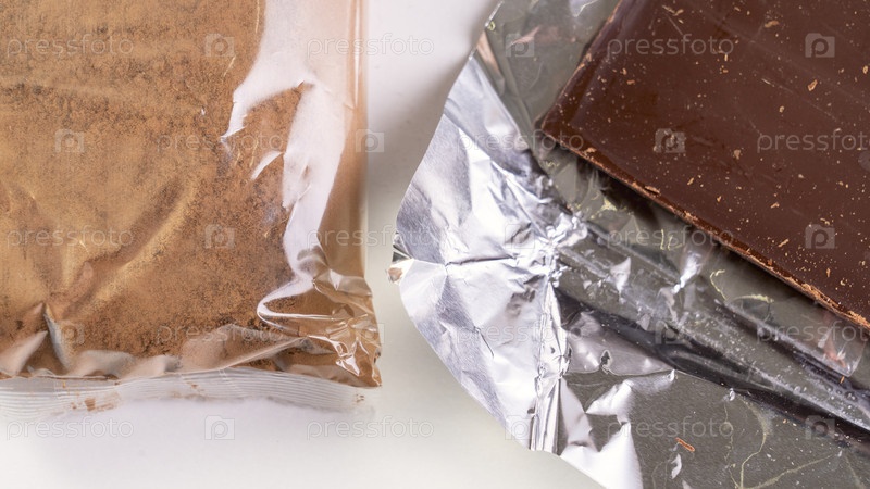 Сумка с шоколадным порошком рядом с упаковкой из шоколадной фольги
