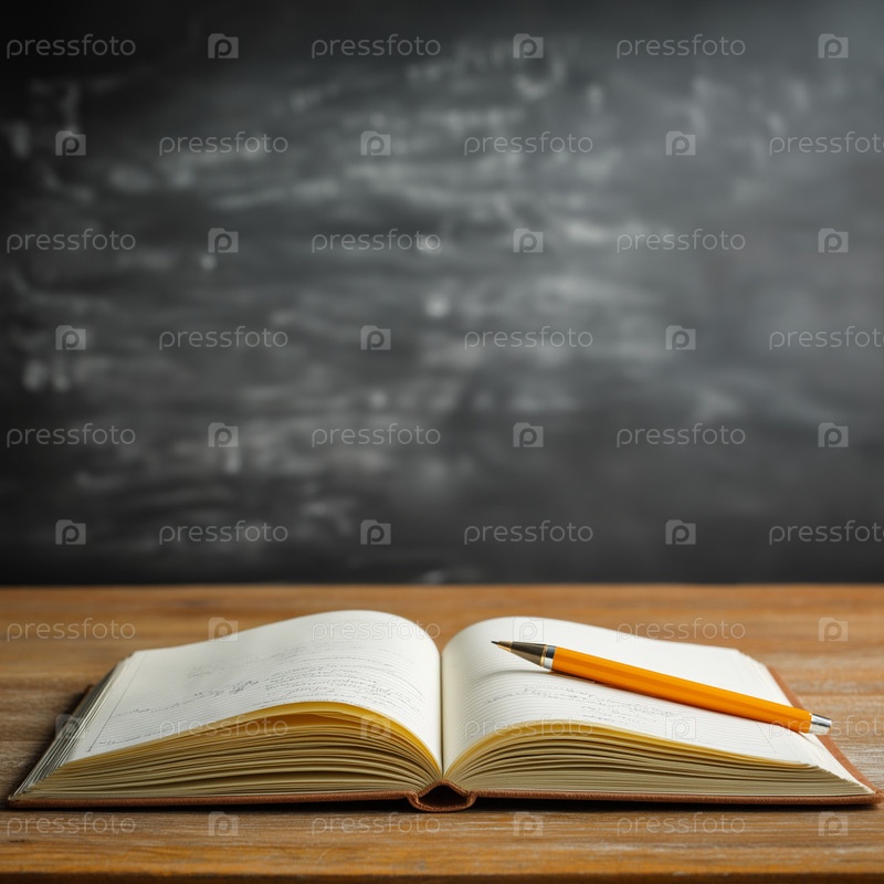 Открытая книга и ручка на деревянном столе перед школьным советом