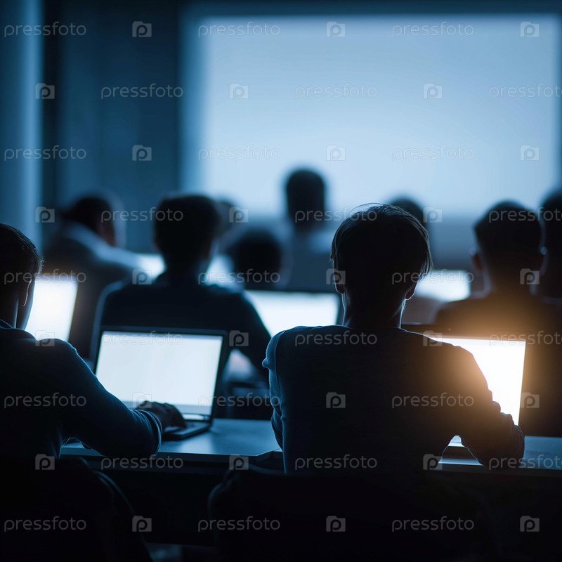 Студенты за ноутбуками слушают лекцию в темной аудитории