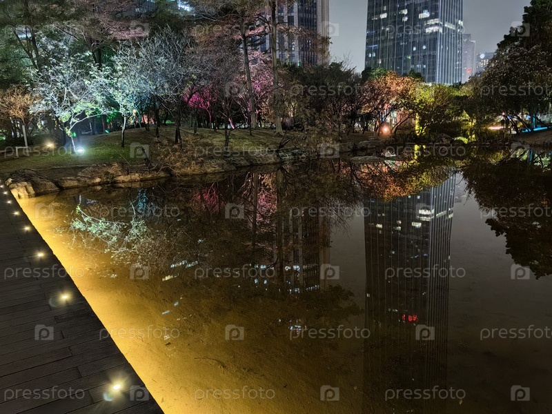 Городской парк Гуанчжоу, центр города представляет собой живописную деревянную пешеходную дорожку или мост, освещенный встроенными огнями, что создает уютную и романтическую атмосферу.Шаг проходит между водоемами или прудами, отражающими свет
