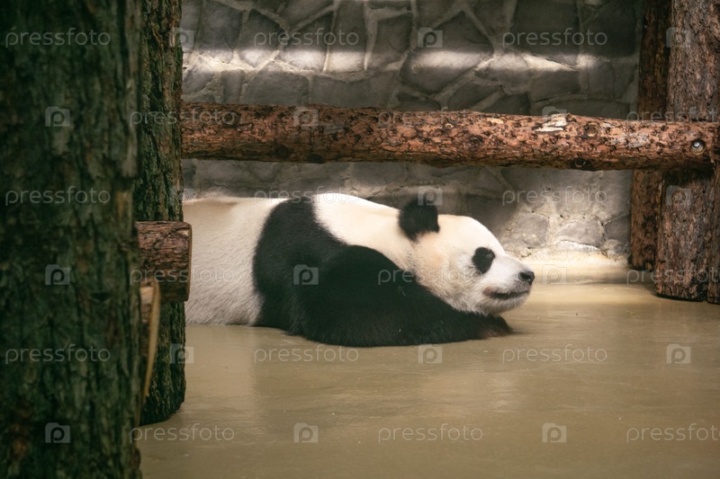 Гигантская панда лежит в зоопарке