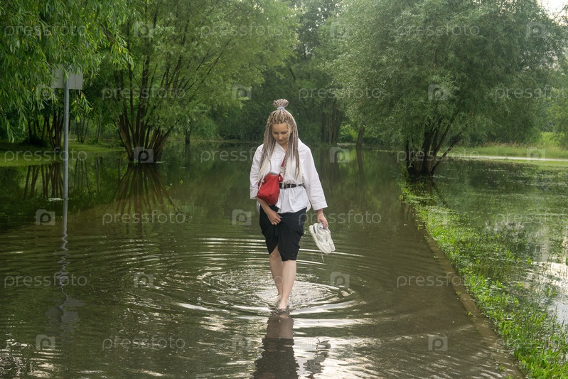 Женщина пересекает лужу в затопленном парке в дождливый день