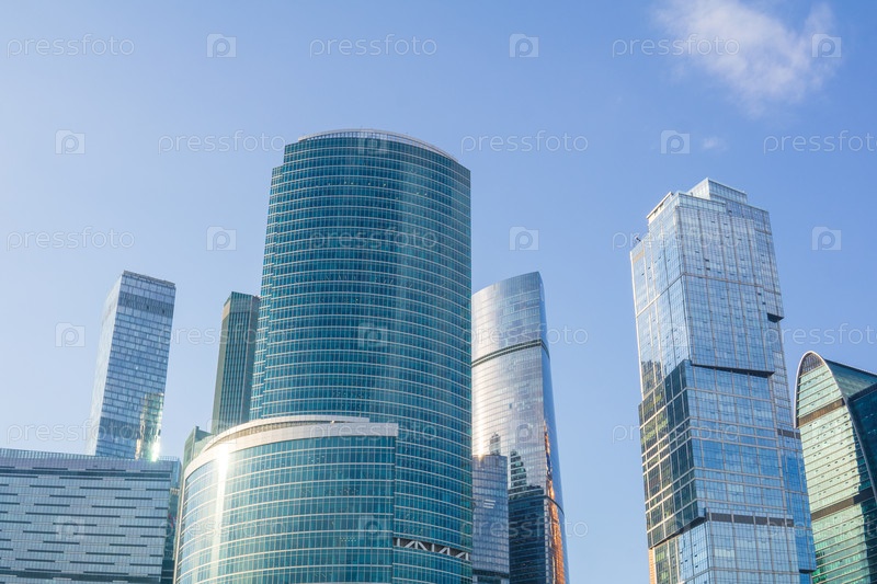 Вид на верхние части современных небоскребов к голубому небу