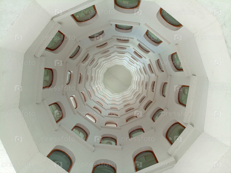 Архитектурный фон, спиральная лестница с окнами, открывающимися в световой колодец