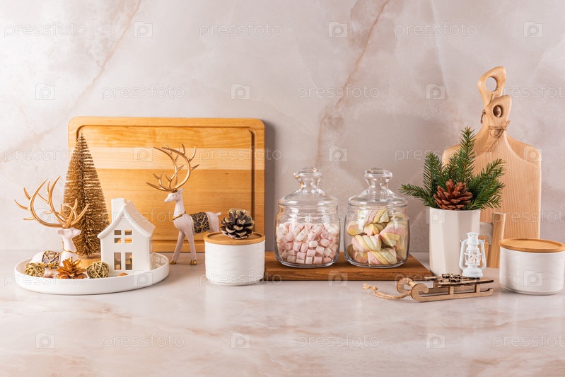 Кухонный фон с кухонными принадлежностями, украшенными на праздник режущими досками, зефирами в стеклянных банках на Новый год и Рождество