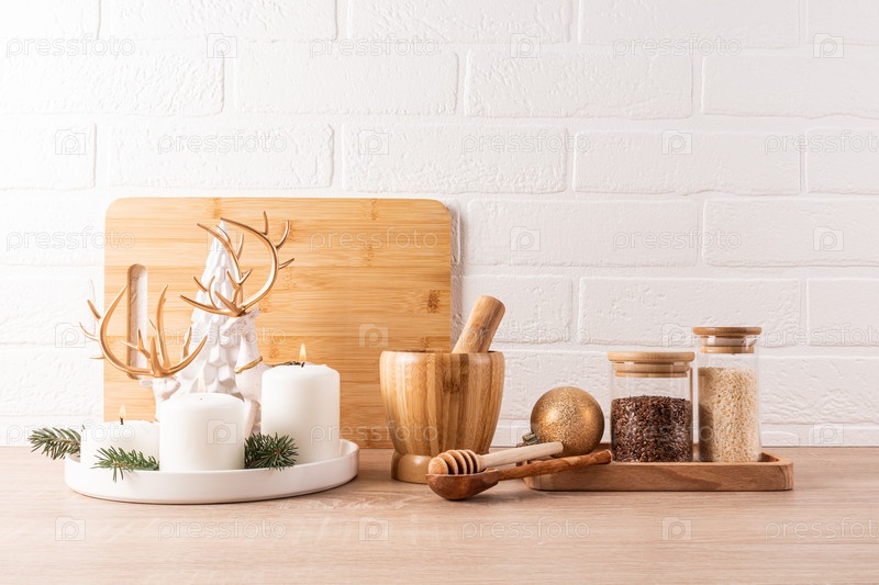 Кухонные принадлежности, банки для хранения специй, украшения на Новый год и Рождество на столешнице кухни