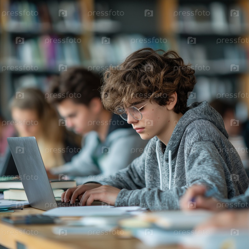 Мальчик с очками работает над ноутбуком в библиотеке