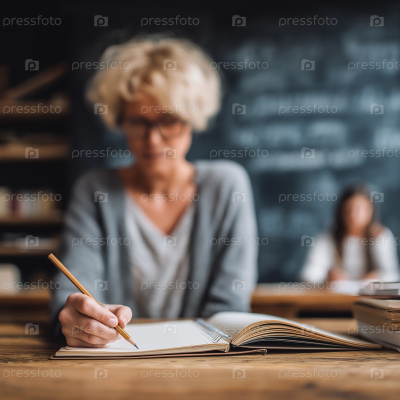 Женщина пишет в открытой тетради за деревянным столом на фоне школьной доски