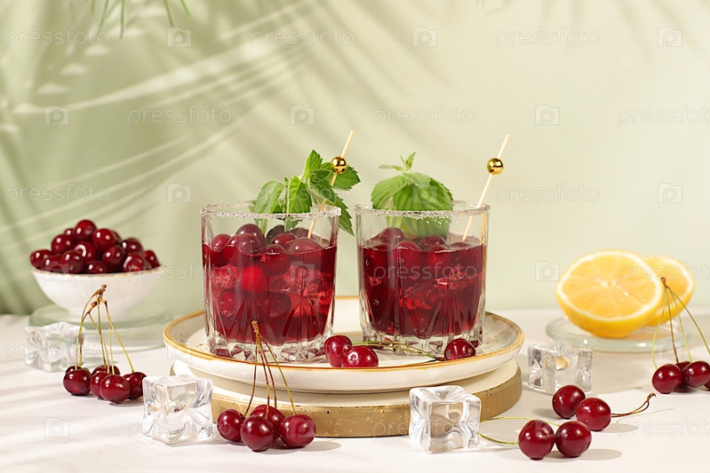 Мохито с вишней, мятой, льдом с текилой, водкой или газировкой на элегантном фоне, минималистическая барная концепция, безалкогольный и алкогольный напиток для похудения, рекламный баннер в кафе