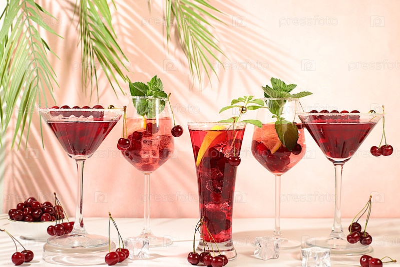 Вишневые алкогольные или безалкогольные коктейли с мятой. Мартини, мохито и королевская сангрия с ягодами, льдом, мяткой и свеклами. Концепция летней вечеринки, реклама в баре или кафе, детоксикация
