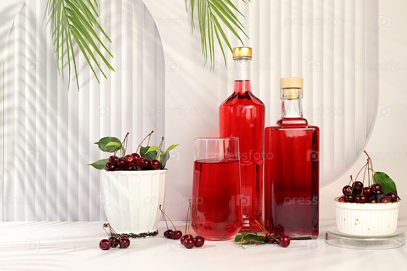 Домашний сильный вишневый сидр в бутылках и бокалах на элегантном фоне, натюрморты с алкогольными напитками и свежими вишнями, концепция домашнего виноделия, минималистический баннер для бара,
