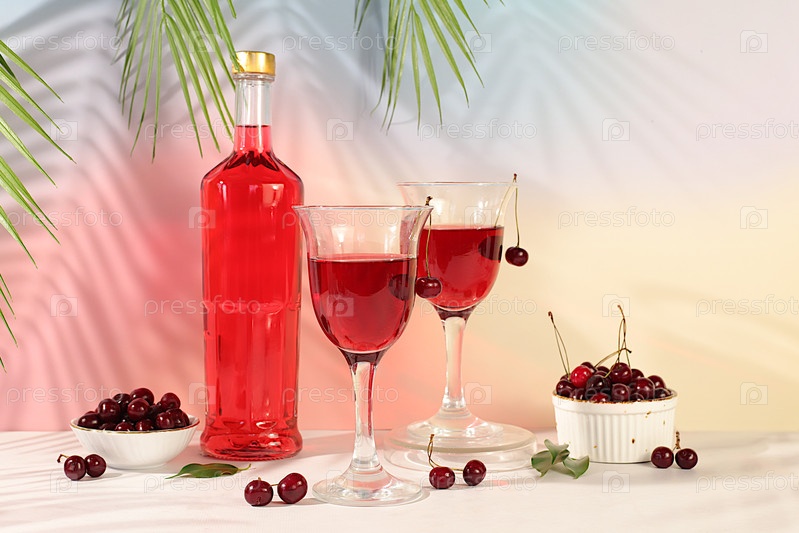 Современный натюрморт со стаканами красного вина с вишнями и ягодами. детоксикационная диета и концепция праздника, осенние витаминные напитки, рекламный баннер для бара или ресторана, фотоменю