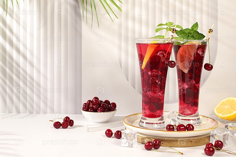 Сангрия или коктейль с мятой, вишней, газировкой, лимоном и льдом, меню ресторана и бара, освежающий рецепт летних и осенних напитков, детоксикационная диета и концепция похудения, холодная домашняя лимонада