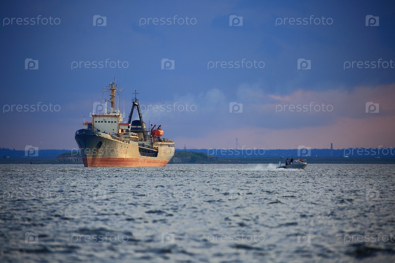 Летний вечерный вид на море с небольшим танкером и моторной лодкой.Кронштадтский рейд, Санкт-Петербург