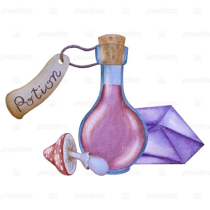 Акварельная иллюстрация набора мифических эзотерических элементов и объектов духовного колдовства. заклинание, небесные кристаллы, зелье, свечи, грибы, таро. идеально подходит для фантастического дизайна, визуальные эффекты ведьмы