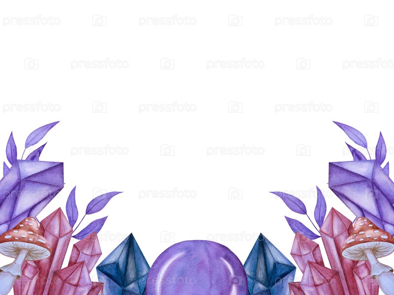 Акварельная иллюстрация набора мифических эзотерических элементов и объектов духовного колдовства. заклинание, небесные кристаллы, зелье, свечи, грибы, таро. идеально подходит для фантастического дизайна, визуальные эффекты ведьмы