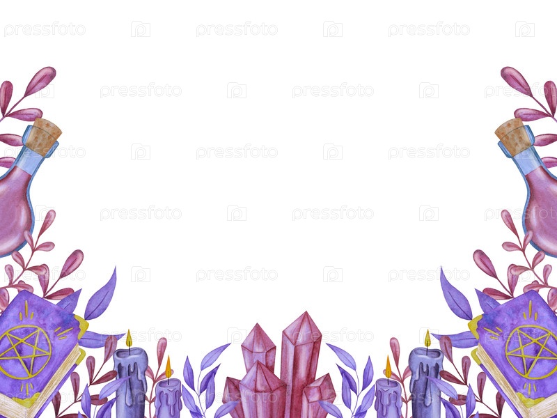 Акварельная иллюстрация набора мифических эзотерических элементов и объектов духовного колдовства. заклинание, небесные кристаллы, зелье, свечи, грибы, таро. идеально подходит для фантастического дизайна, визуальные эффекты ведьмы