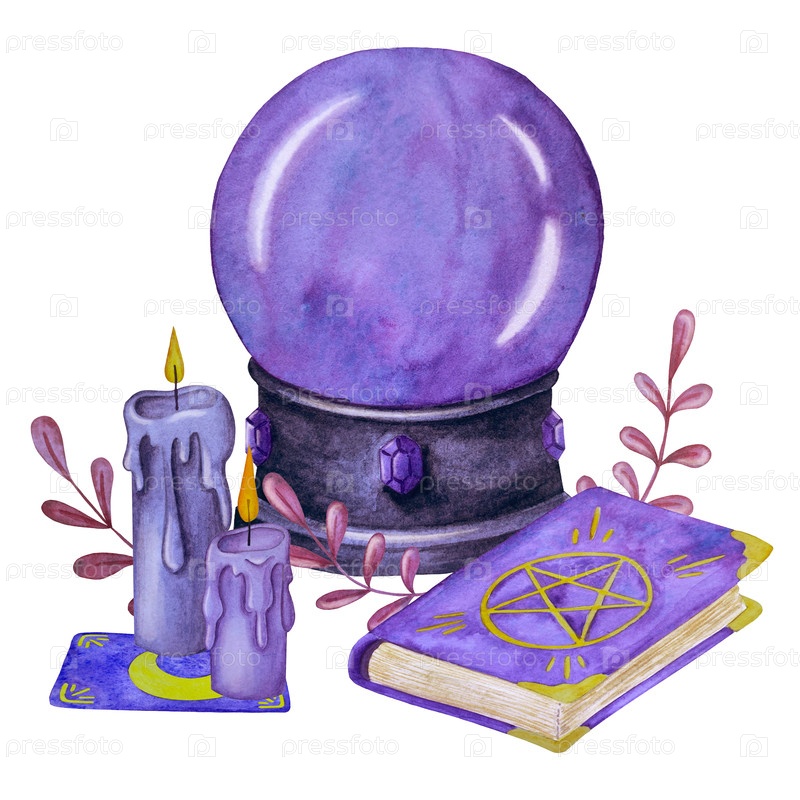 Акварельная иллюстрация набора мифических эзотерических элементов и объектов духовного колдовства. заклинание, небесные кристаллы, зелье, свечи, грибы, таро. идеально подходит для фантастического дизайна, визуальные эффекты ведьмы