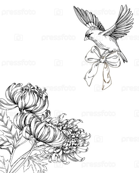 Угловой каркас с хризантемами и птицей для дизайна упаковки, карт, обложек, принтов, этикеток на продуктах и тканей